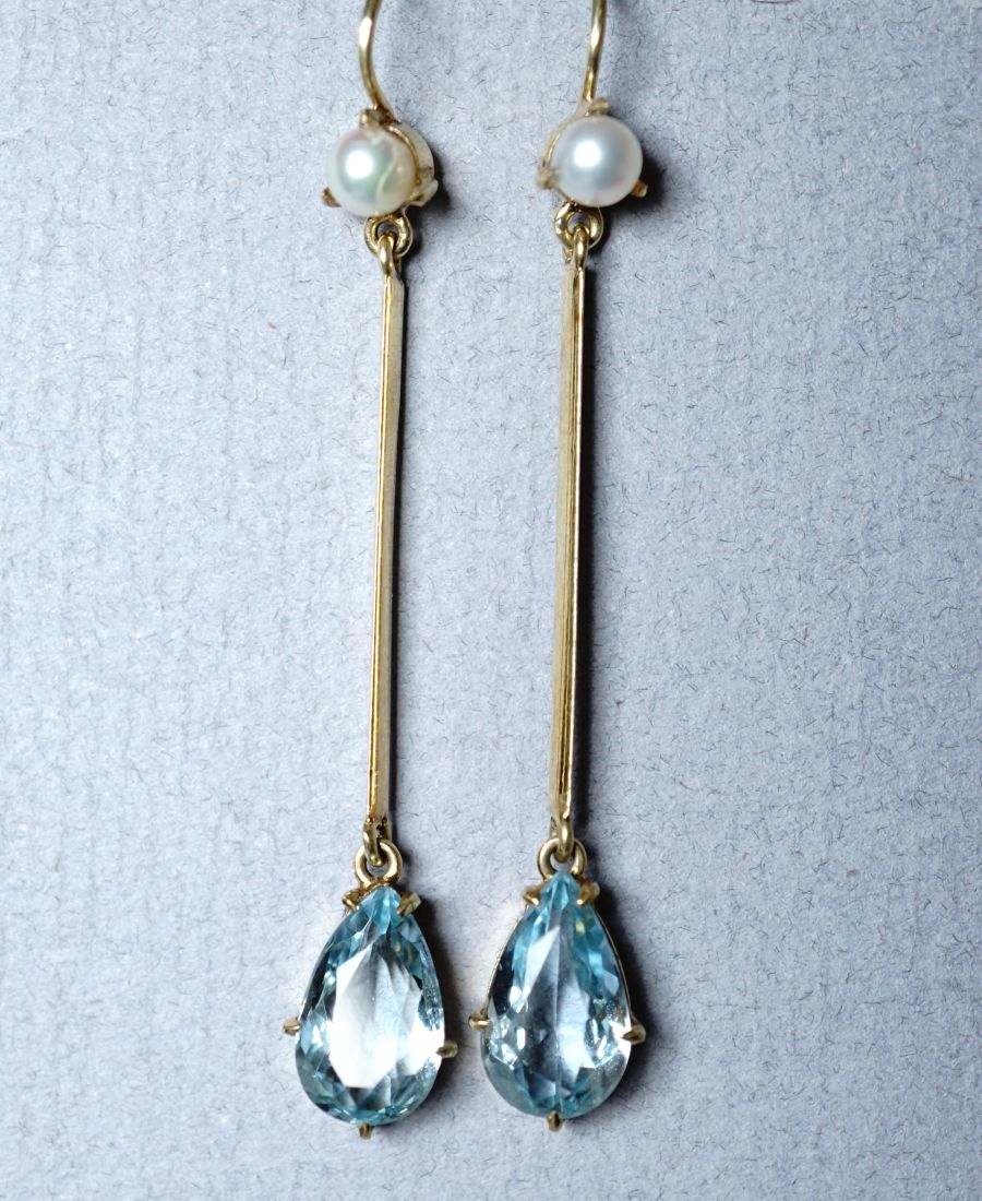 Im langen beweglichen Schmuckelement wurden zwei tropfenförmige Aquamarine in Krappen gefasst. Die facettierten Edelsteine messen ca.10 x 6 x 4mm, ca.1.20ct jeweils gefasst vermessen, total ca.2.30ct an schöner Aquamarine. Oben unter den Haken ist jeweils eine kleine weisse Zuchtperle gefasst, diese messen ca.4mm im Durchmesser