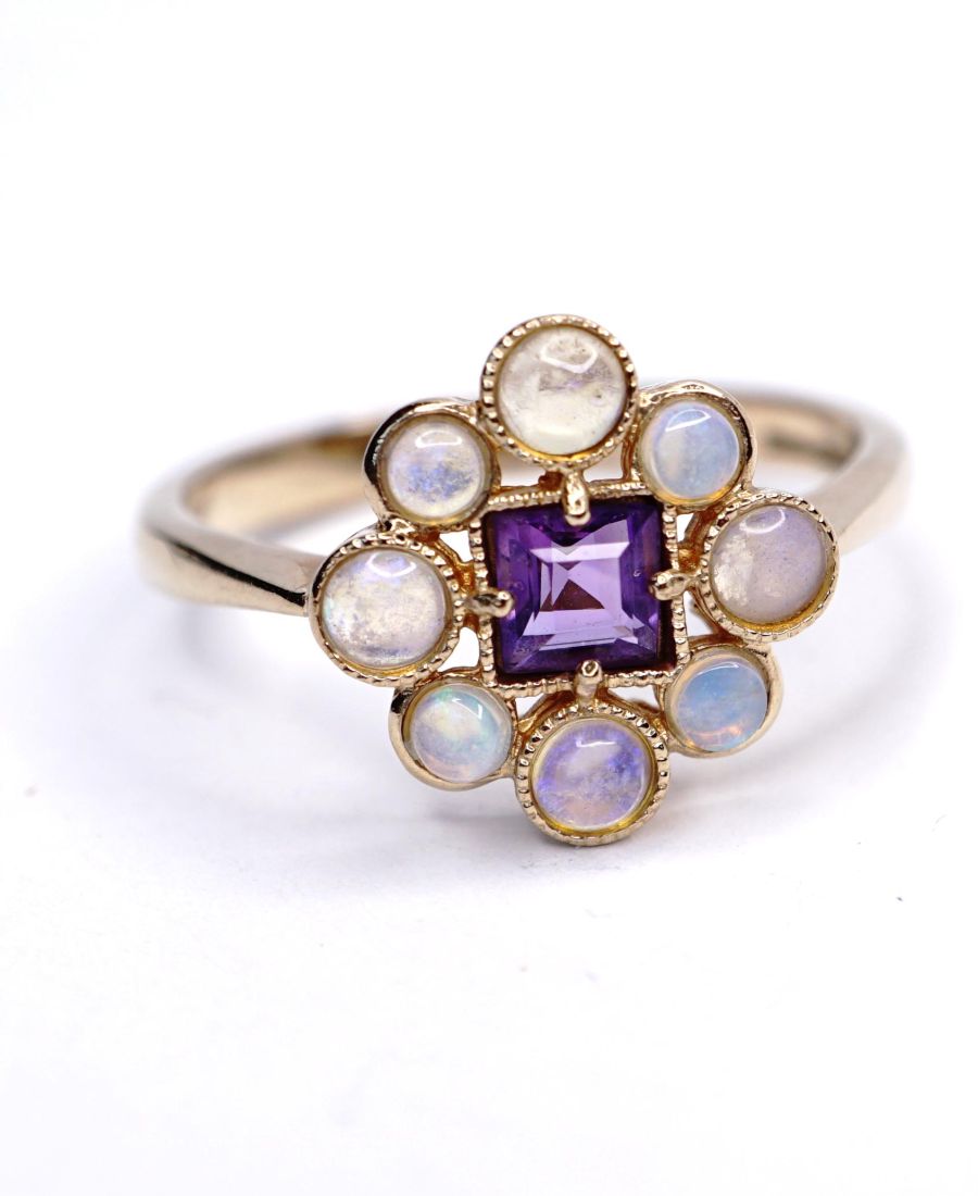 Sehr schöner englischer vintage Ring 375/000 Gelbgold Amethyst + Opale B4247