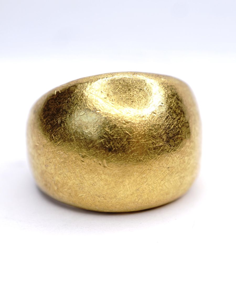 Der Ring ist bombiert, breit voluminös! Die Oberfläche wurde gebürstet und schön vergoldet. Er misst vorne knapp 1.8cm in der Breite und er wiegt schwere 22g, die Ringgrösse ist 59