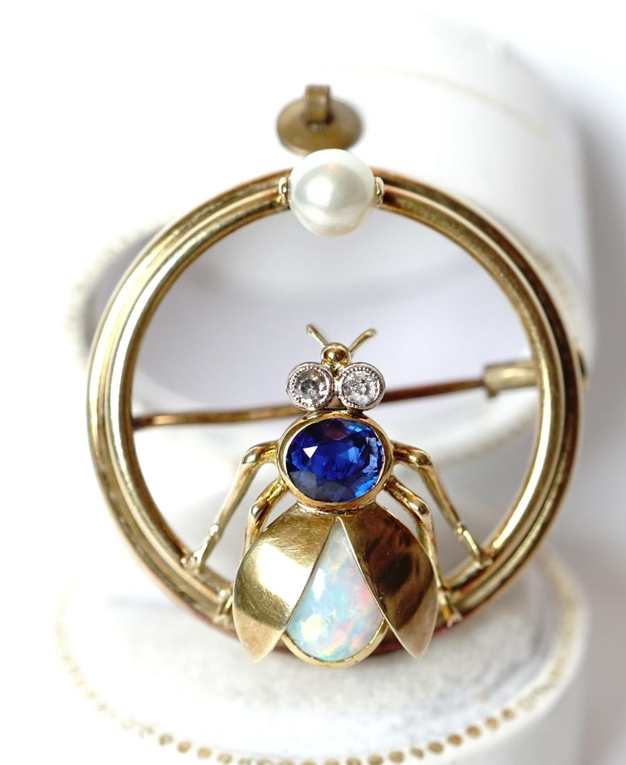 Antike grosse Art Deco Brosche Fliege 585 Gelbgold Saphir-Opal-Diamanten B4261