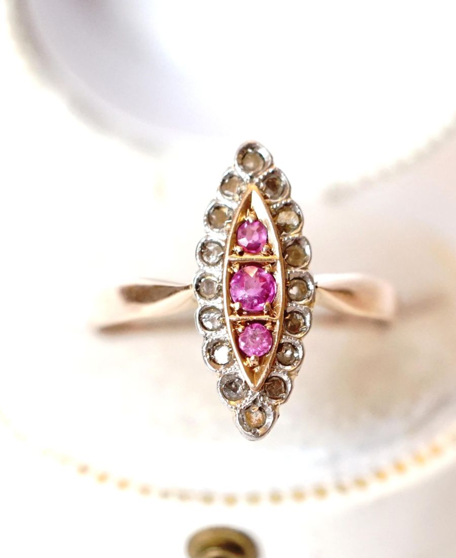 Im navette förmigen oder Schiffchen Ringkopf wurden 3 rund-facettierte Rubine und 16 kleine Diamanten im Altschliff gefasst. Der mittige Rubin misst ca.2.5mm im Durchmesser, die 16 Diamanten ca.1mm. Die Diamanten sind Weiss mit natürlichen Einschlüssen, total ca.0.25ct an Edelsteinen, gefasst vermessen. Der Ringkopf, der mit Platin veredelt ist, misst 15 x 6mm und das Gewicht des Ringes beläuft sich auf 1.5g