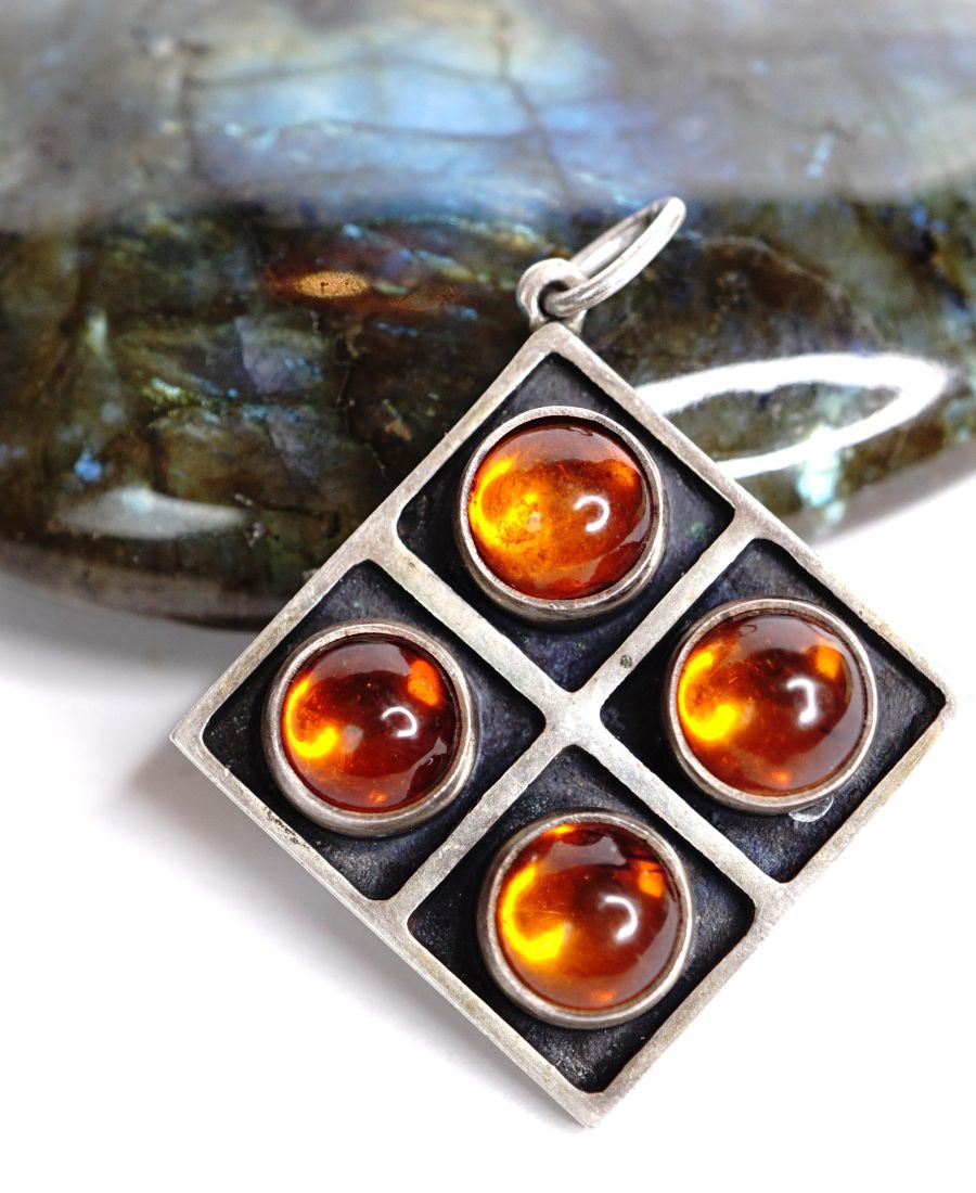 Das schöne quadratische Design wird von den 4 cabochon geschliffenen Bernsteinen aufgelockert. Der Anhänger misst 4 x 3.2cm und er wiegt 7.4g