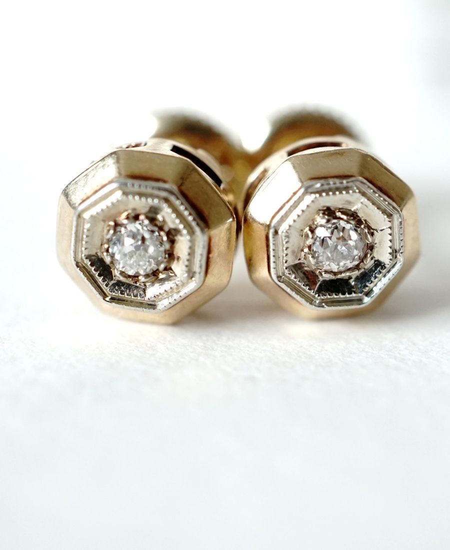 Die hübschen Ohrstecker messen 7.5mm im Durchmesser und sie sind 4.4mm hoch. Sie wurden achteckig gearbeitet, der innere Bereich ist in Weissgold, darin ist je ein kleiner funkelnder Diamant im Altschliff zu sehen. Die Diamanten/Rosen messen je ca.2.5mm im Durchmesser, ca.0.10ct total, gefasst vermessen, sie sind Weiss (H) und von einer si Reinheit