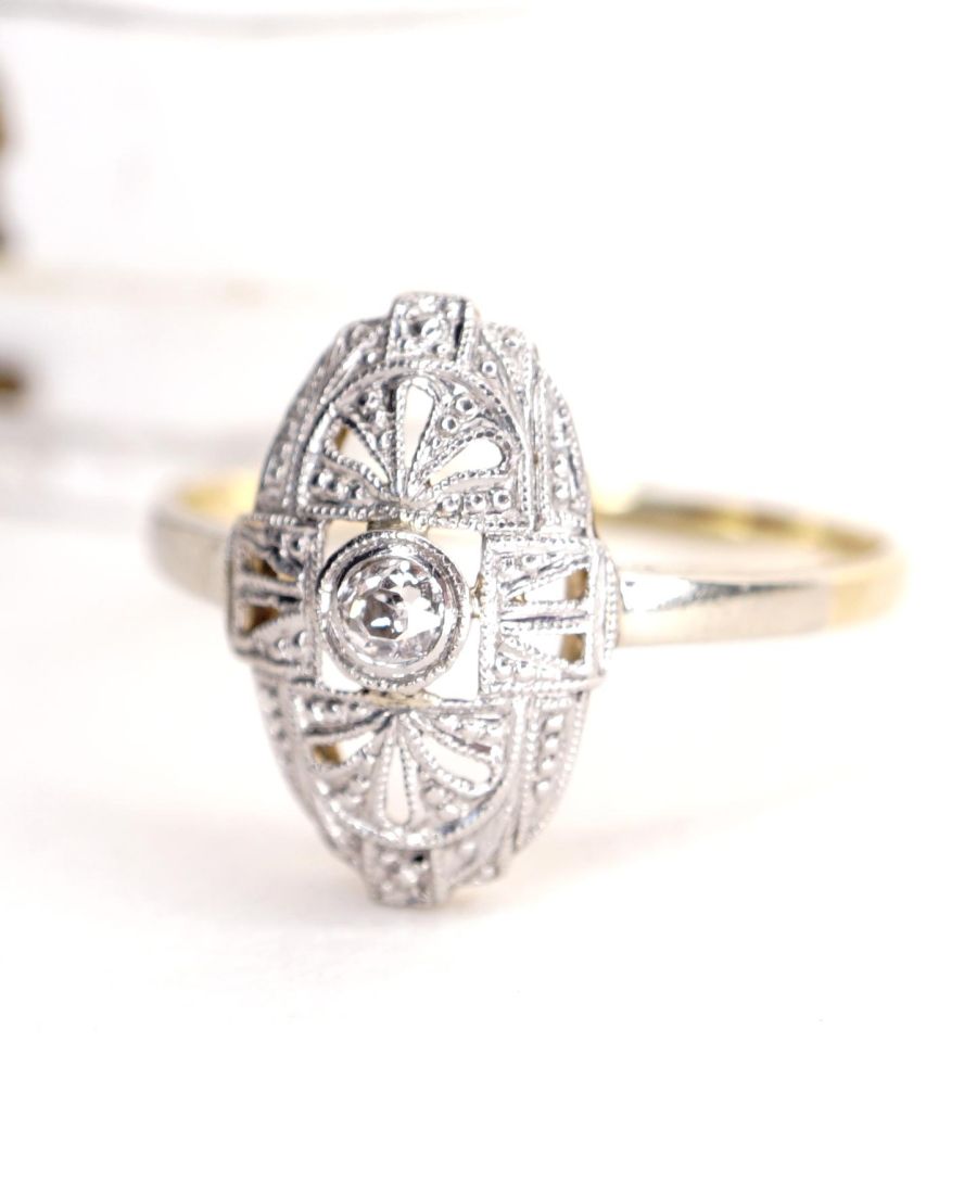 Dieser antike Ring wurde um 1920 aus 585/000 Gelbgold und Platin geschaffen
