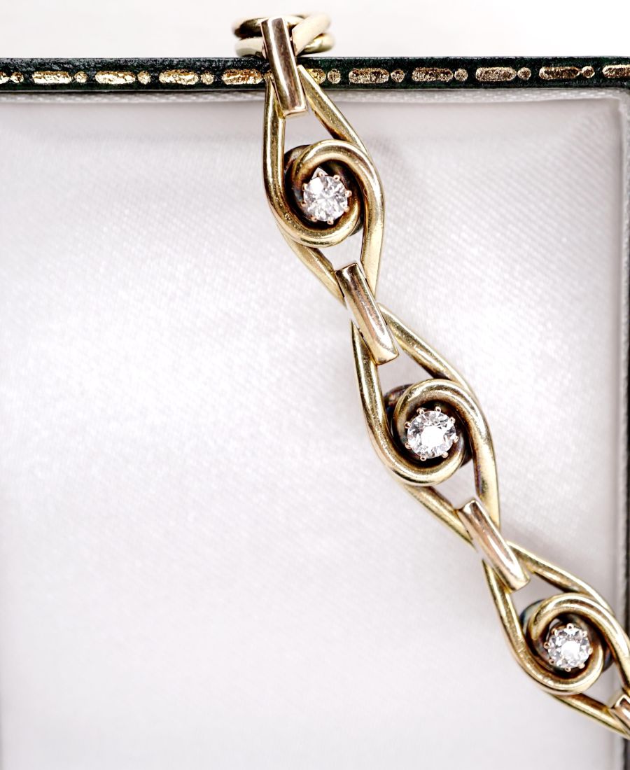 Das wunderschöne Armband misst ca.18.5cm in der Länge und ist mit einem Sicherheitskettchen zum Kastenschloss versehen. Die ovalen zur Mitte hin grösser werdenden Schmuckelemente messen an ihrer breitesten Stelle fast 1cm. Im breitesten mittleren Element und den zwei flankierenden wurden 3 grosse Diamanten im Altschliff gefasst, ca.0.50ct total gefasst gradiuert