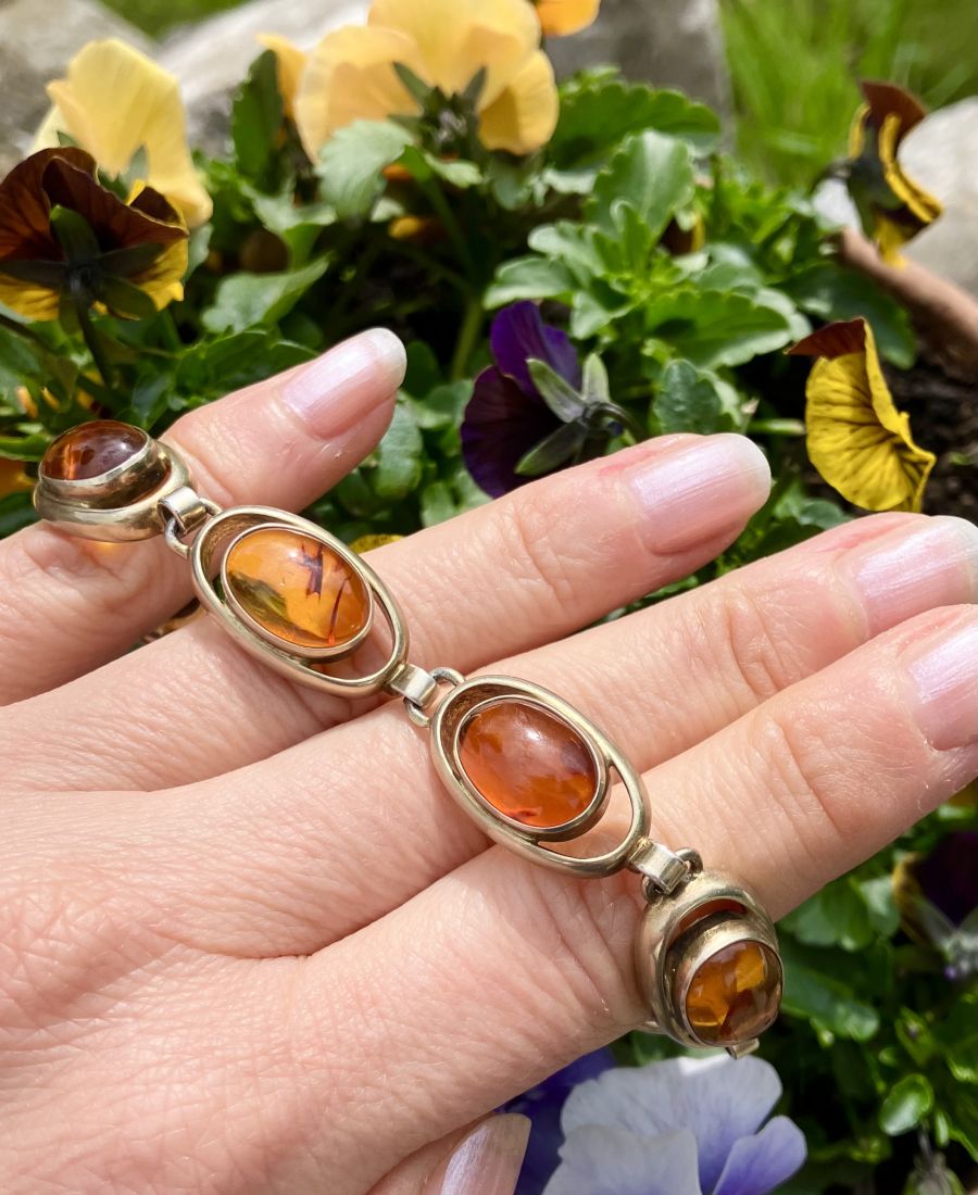 Das schöne Armband ist mit 7 ovalen beweglichen Gliedern ausgestattet, in jedem ist ein ebenso oval-cabochon geschliffener Bernstein zu sehen. Das Armband misst ca.18cm in der Länge und es ist 1.3cm breit