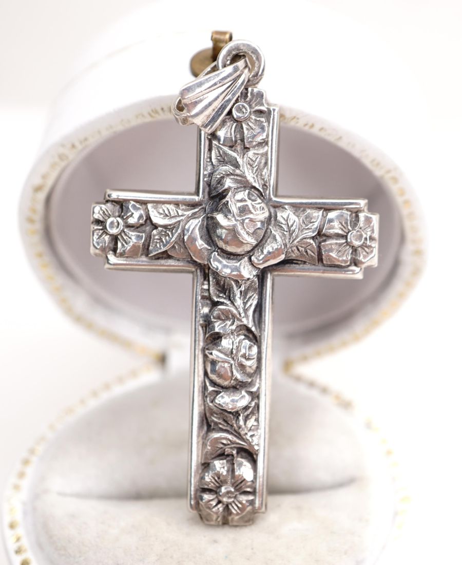Antiker Art Deco Kreuz Anhänger aus 835/000 Silber mit Rosen B4423
