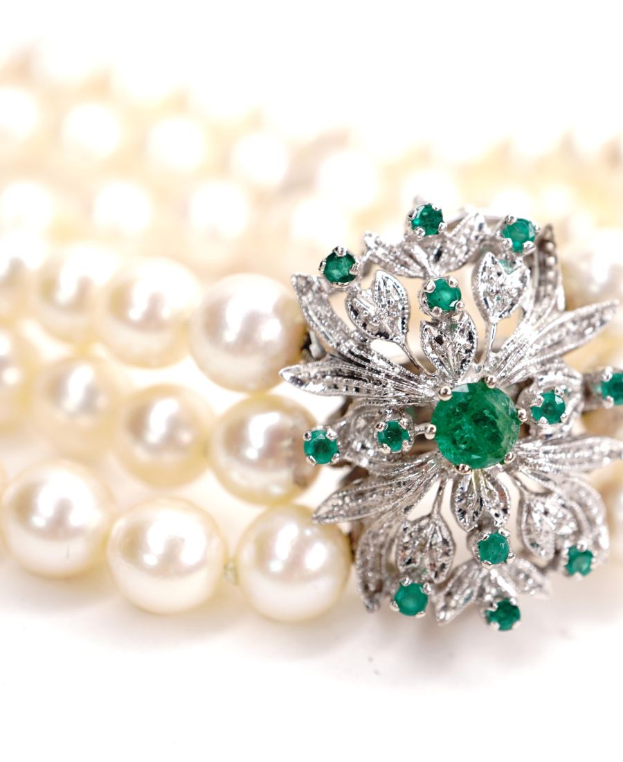 Kostbares 3 reihiges Akoja Zuchtperlen Armband 750 Weissgold mit Smaragden B4380