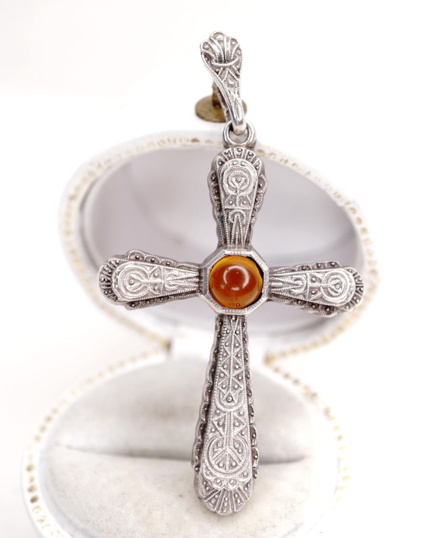 Antiker Art Deco Kreuz Anhänger aus 835/000 Silber mit Bernstein B4424