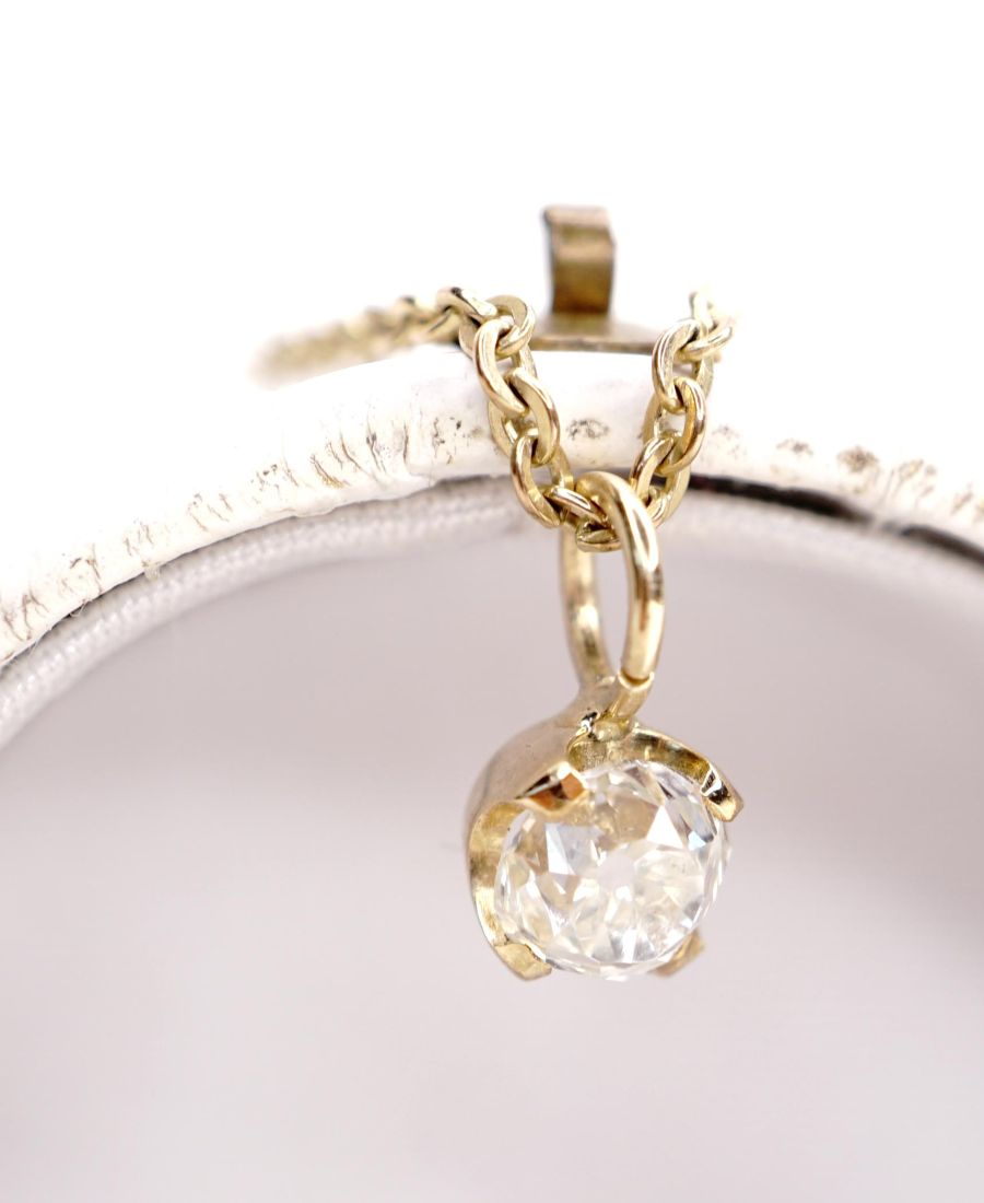 Gefasst wurde ein schöner strahlender Diamant-Solitär mit ca.0.50ct im Altschliff, er misst ca.4.5mm im Durchmesser und auch 4.5mm in der Tiefe. Der Diamant ist von einem leicht getönten Weiss (I) und er ist von einer vvs2 Reinheit. Mit Aufhängung misst der Anhänger knapp 9mm und er wiegt unter 1g