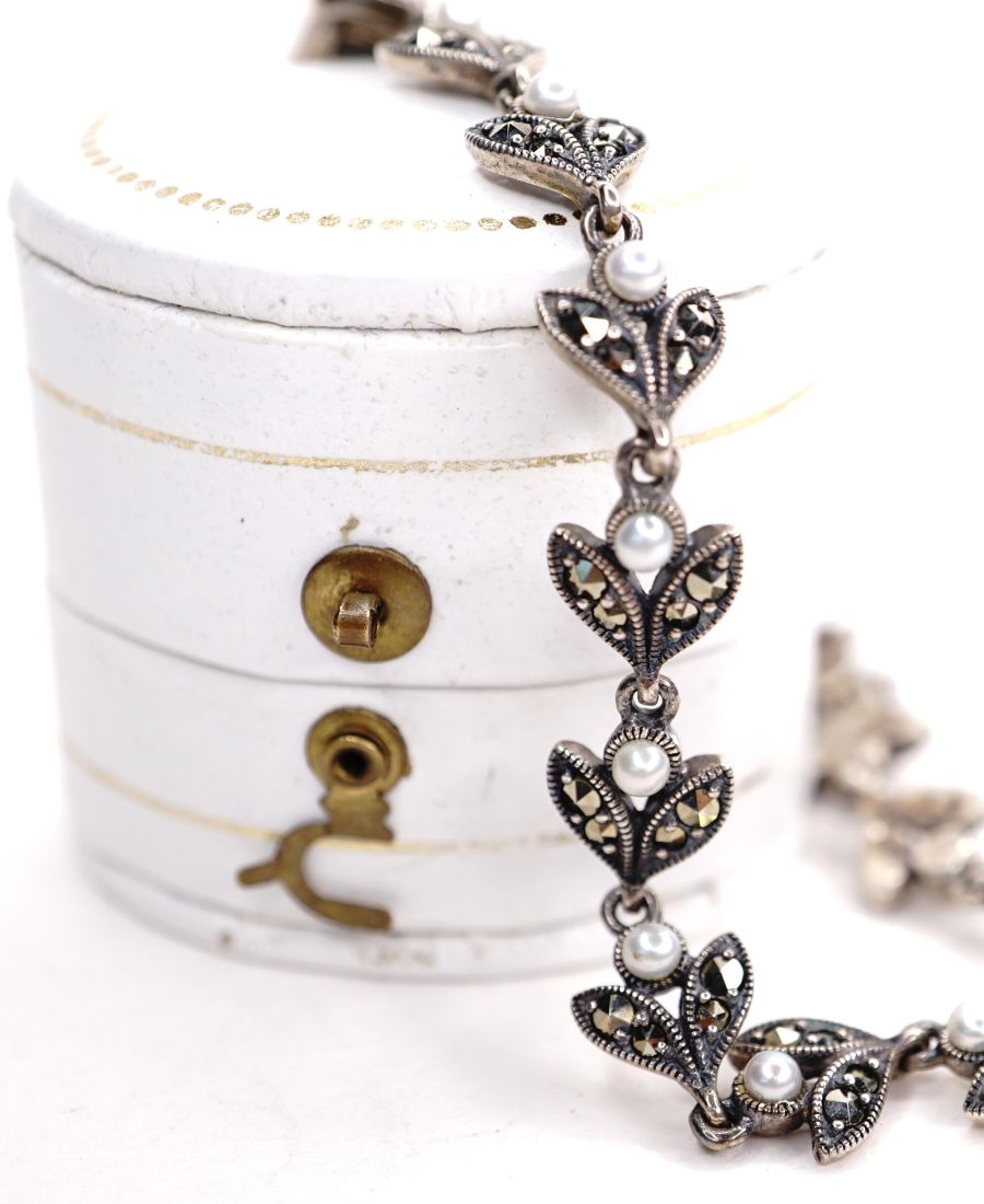 Wunderschönes Art Deco Armband aus 925/000 Silber mit Markasiten + Perlen B4407